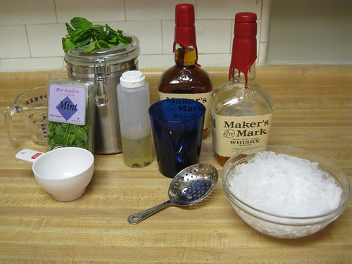 You will need a good quality bourbon (the second bottle is in case Texas Gal shows up), sugar, mint, and crushed ice. To make this style of julep, prepare a a mint-infused simple syrup.