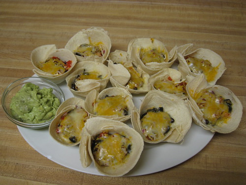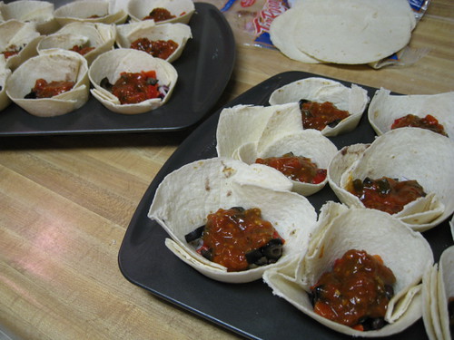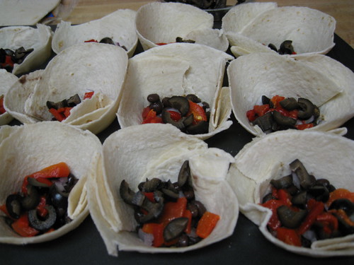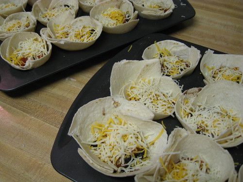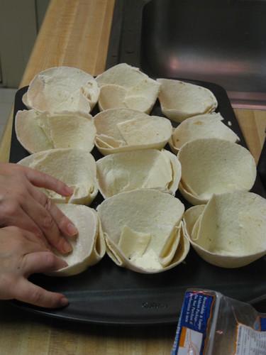 ![]() Oil up your muffin pan and fold the tortillas into little cups that line the pan. Don't worry if they stick up like little Michigan Stadiums up out of the bowls.