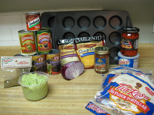 Pretty much whatever you have handy that you would love to have on a tostada. It's still early in the season so you have plenty of time for experimenting with new formations. For 24 servings, I recommend two or three cans of black beans, ground beef or chicken if you like, (although I think meat make the cups soggy and heavy), onions, salsa, olives, cheese, various peppers, cumin, and sour cream. Anything you think either Nate Newton or Casey Hampton would put on their tostada. The only three must-haves are shortening, fajita sized tortillas, and muffin pans. Chop onions, roasted red peppers, and olives. If you prefer a spicer kick, also chop up a couple of chipotle peppers packed in adobo sauce. (Do not go overboard with the chipotle as they are roasted jalape�o peppers with a fancy name. Like Ed Hochuli and Mike Carey calling the same game, it is too much heat!)