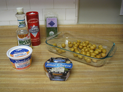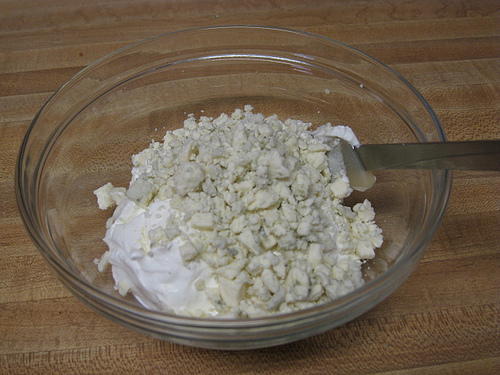 While the potatoes are baking, mix blue cheese and sour cream together. Yes this picture shows more than what the recipe calls for, mostly because knew I would need some more of this mix for the next night. (And actually, the blue cheese opens up more with time, so if you can, make this mixture the night before.)